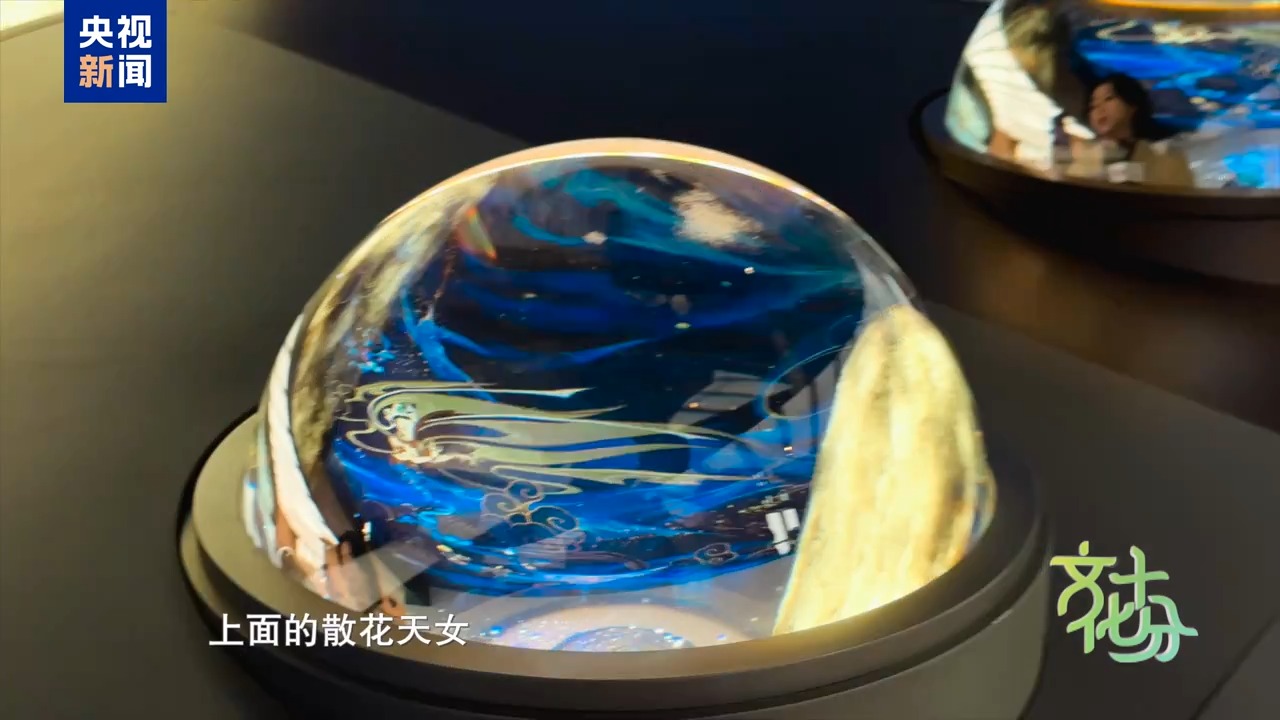 中央美术学院建筑学院副院长 中国馆项目展陈顾问执行负责人 崔冬晖:我们用了常老师描绘的隋代的散花天女的图案在顶部发光,人们去看这个月壤的时候,这个球体能够反射到上面的散花天女。用艺术的方式体现了中国人的极致浪漫与现在科技强国的特征的集合。