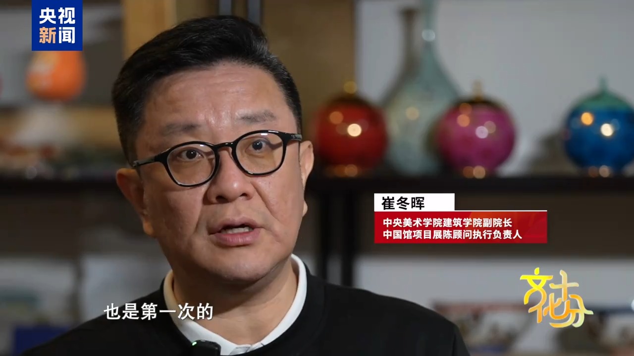 中央美术学院建筑学院副院长 中国馆项目展陈顾问执行负责人 崔冬晖:常沙娜老师设计的这个四幅,包含了中国传统纹样的大集成的图案图形,后面顺应着二十四节气放大到20米的高清LED屏上,这在中国的图案史上是第一次既呈现了中国古人的文化审美的自信,也呈现了中国的图案体系的精妙与伟大。尤其是一进场能够看到的这个大型的多媒体,绝大部分人都会在这留影。