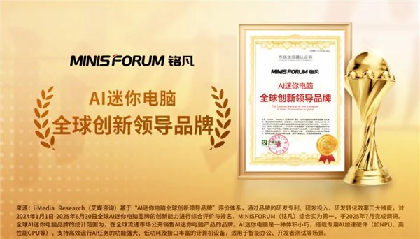 MINISFORUM 铭凡作为深耕迷你主机领域的专业品牌, 始终专注于为企业与用户提供稳定、可靠的高性能计算解决方案。其全球用户已突破 400 万, 业务覆盖 150 余个国家和地区, 产品以出色的品质、创新的设计和持续的客户支持而受到广泛信赖。近期,MINISFORUM 铭凡更凭借市场表现与产品创新力, 获得全球权威数据机构艾媒咨询颁发的六大认证:" 高性能迷你电脑全球销量王 "、"AI 迷你电脑全球创新领导品牌 "、"AI 迷你电脑行业第一品牌 " 等。