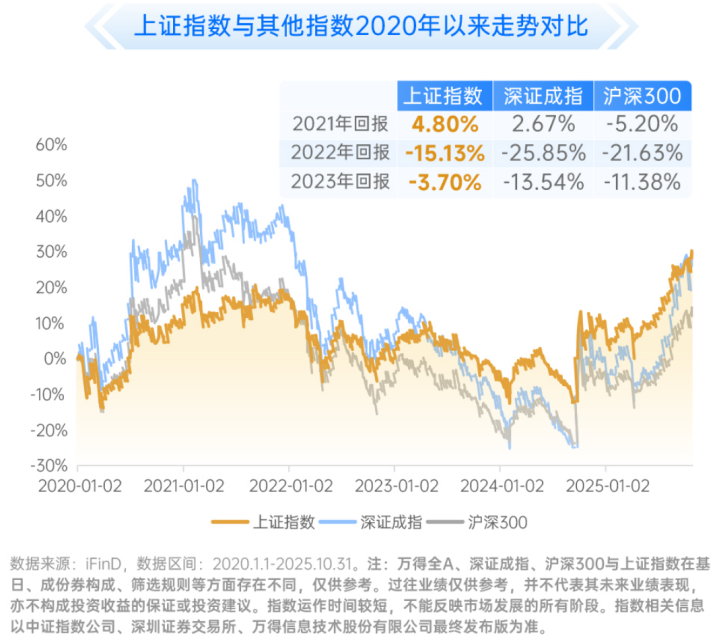 回顾过去五年,从2020年以来至2025年10月底,上证指数区间上涨29.66%,年化收益率4.71%,年化夏普比率0.27,对比沪深300、深证成指均位列第一。