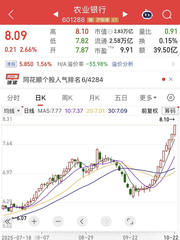 10月22日收盘,农业银行(601288.SH)股价定格于8.09元/股,涨幅2.66%,走出“14连阳”,总市值达到2.83万亿元,稳居A股首位。